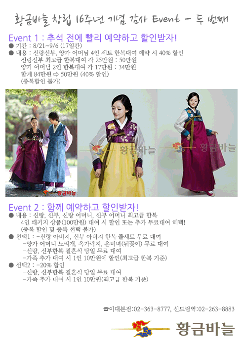µÎ ¹øÂ° ÀÛÀº À̺¥Æ®¸¦ ÁغñÇÏ¿´½À´Ï´Ù. ¿Ã °¡À» °áÈ¥ Áغñ¸¦ ÇϽô °í°´´Ôµé¿¡°Ô µµ¿òÀÌ µÇ±æ ¼Ò¸ÁÇÕ´Ï´Ù.